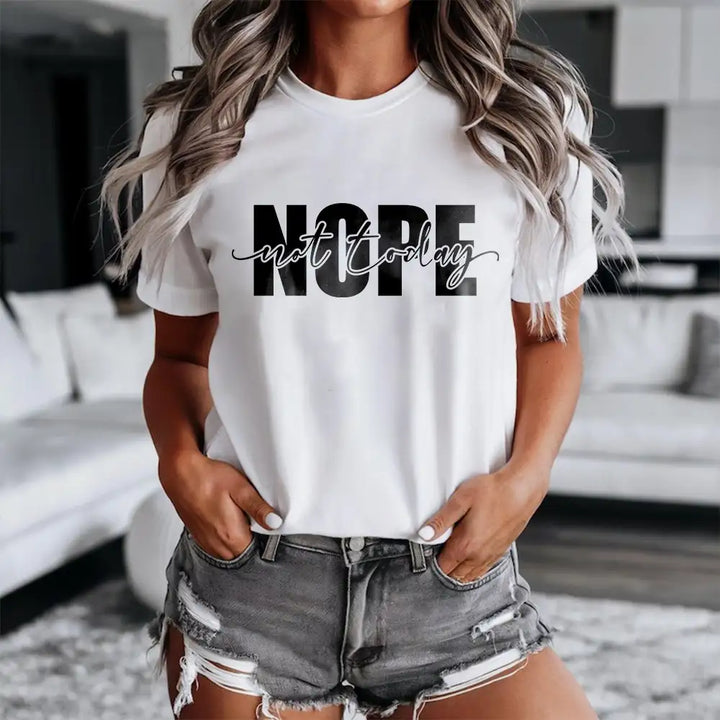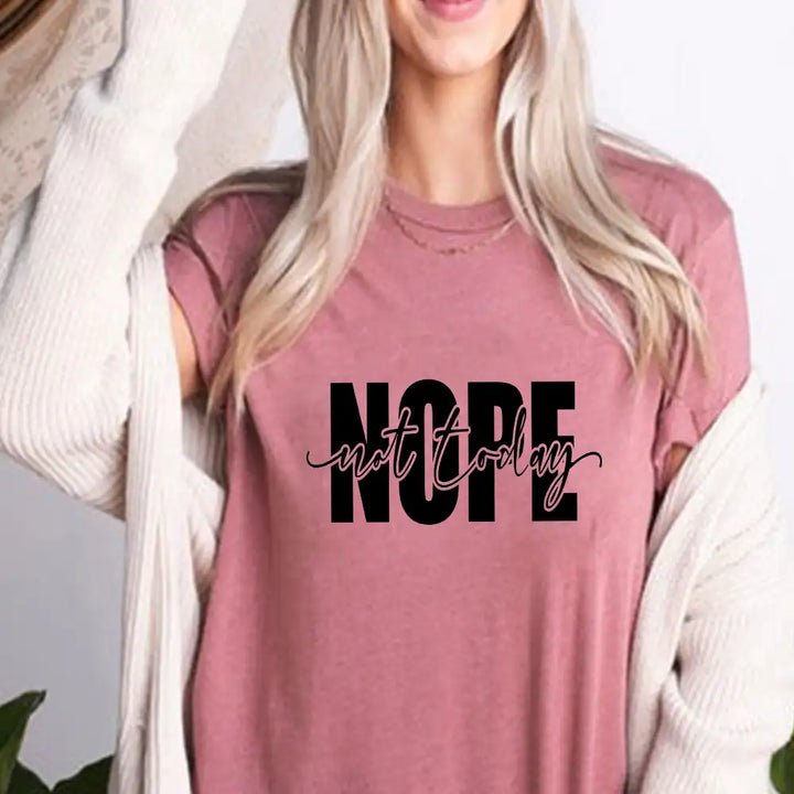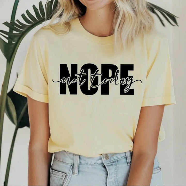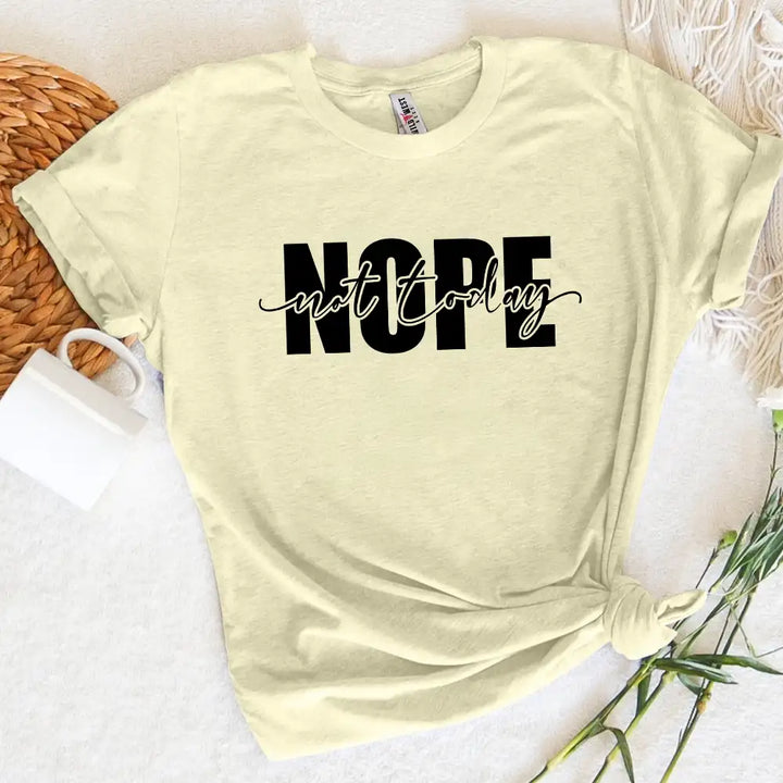 Make a bold yet humorous statement with this "Nope, Not Today" minimalist typography t-shirt! This simple yet impactful design is perfect for those who love a sarcastic, laid-back, and witty attitude. Whether you're avoiding responsibilities, dodging social interactions, or just embracing your lazy, chill mood, this tee speaks for itself.