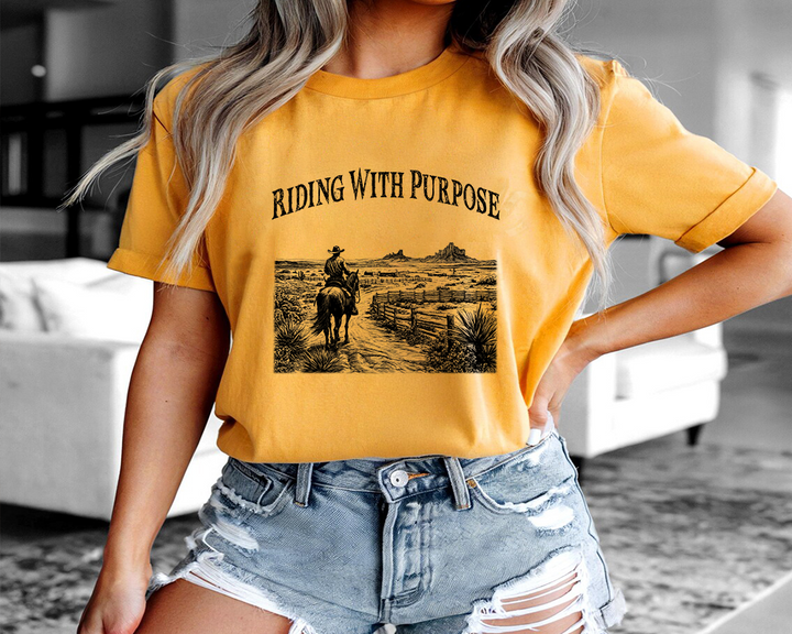Saddle up and embrace the spirit of the Wild West with the "Riding with Purpose" tee! Featuring a detailed cowboy on horseback, gazing over a vast western landscape, this design captures the essence of freedom, resilience, and the untamed frontier. Perfect for cowboys, ranchers, country lovers, and anyone who appreciates classic Western aesthetics.