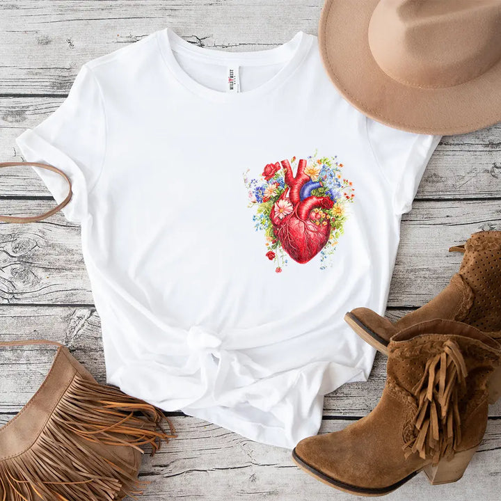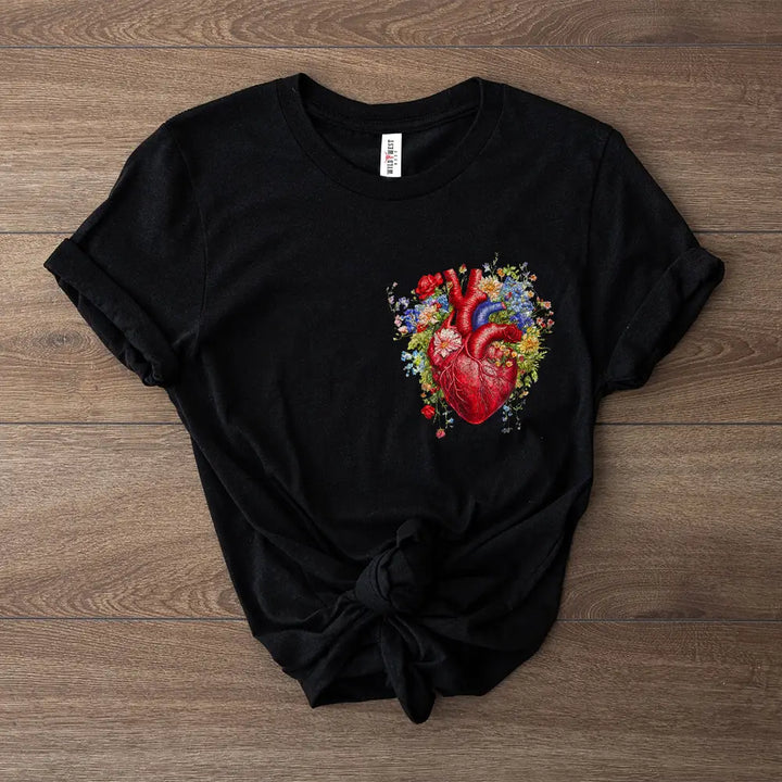 Express your bold and free-spirited style with our Wild Heart Floral Short Sleeve Tee. This unique design features a beautifully detailed anatomical heart surrounded by a vibrant burst of wildflowers, symbolizing passion, nature, and individuality.